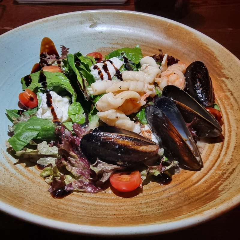 Салат из морепродуктов, зелени и мягкого сыра.