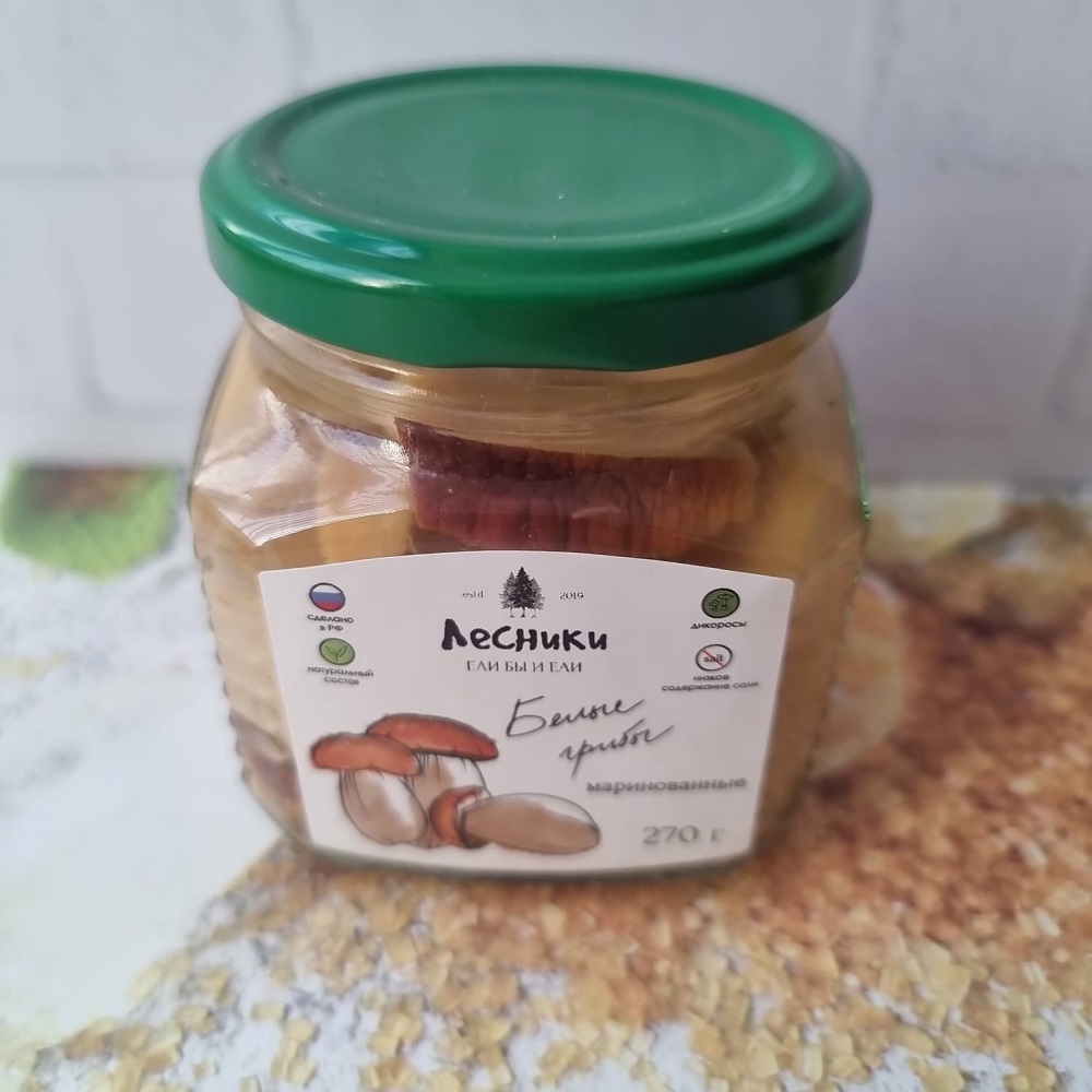 Грибы белые резаные, маринад (вода,соль, сахар, консервант уксусная кислота, перец черный горошек, лавровый лист, семена укропа, чеснок)