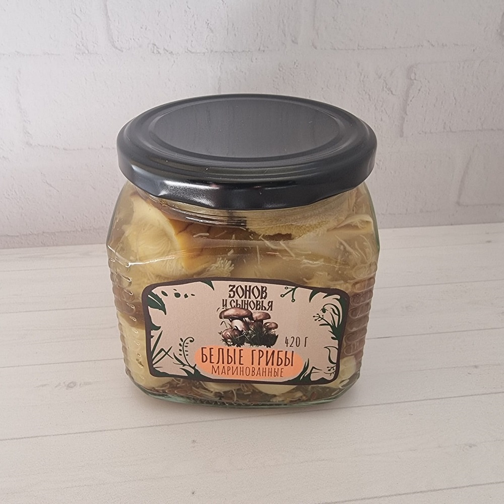 Грибы белые боровые резаные, маринад (вода,соль, сахар, консервант уксусная кислота, перец черный горошек, лавровый лист, семена укропа, чеснок)