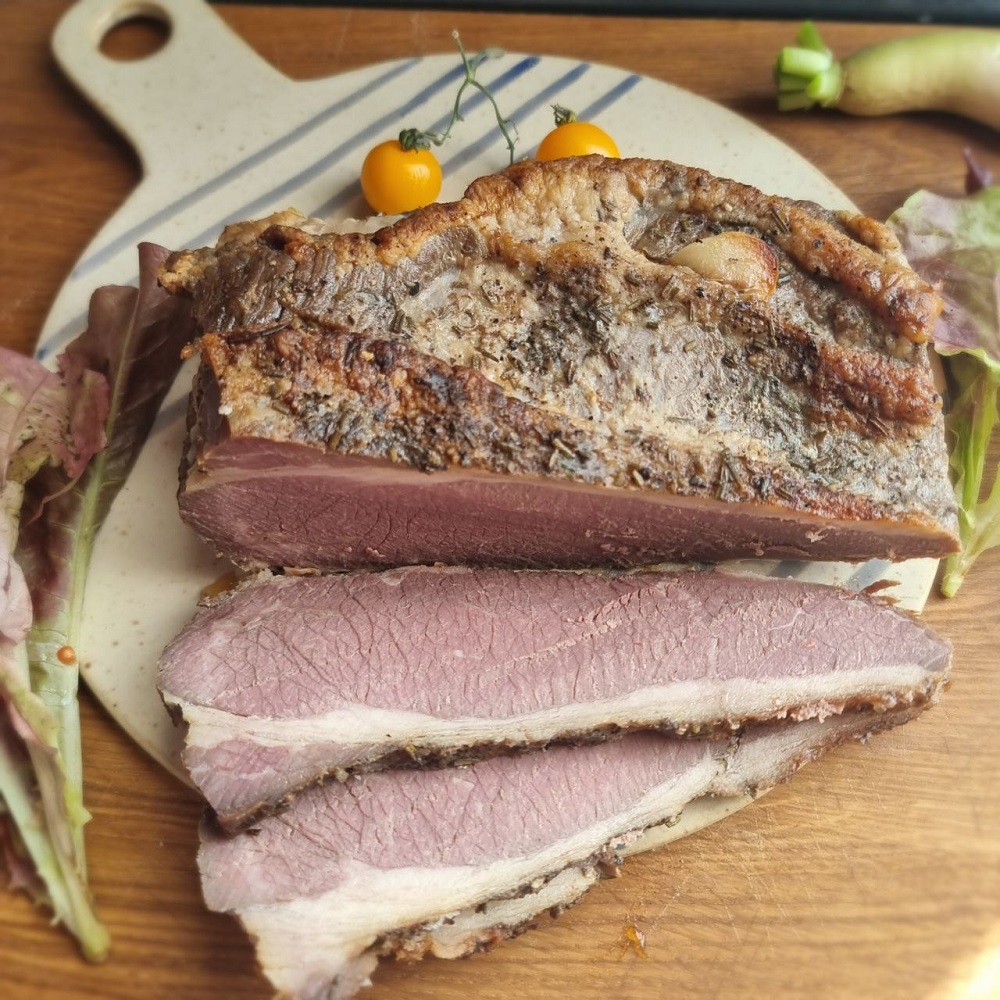 Грудинка бескостная хороша для запекания. Замаринуйте предварительно в любимых специях и запекайте в духовке до готовности час полтора.