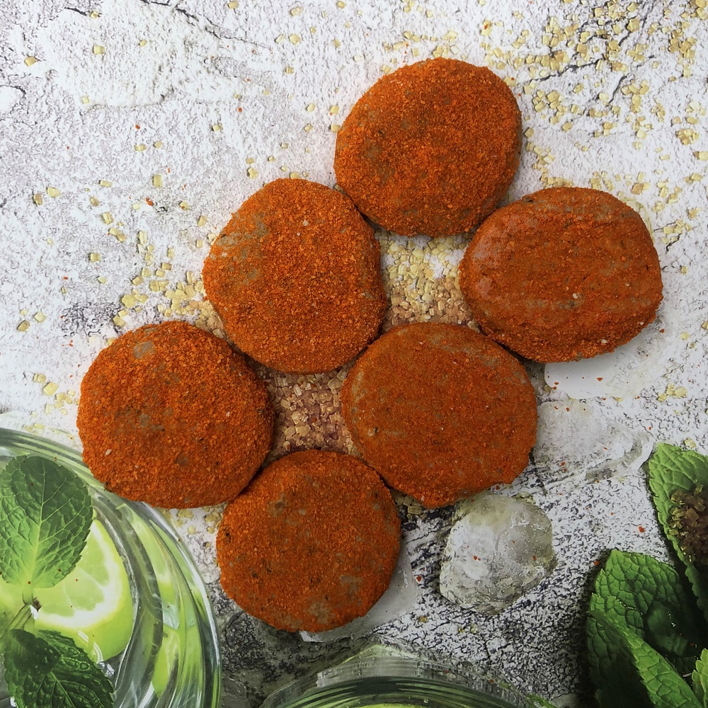 Фарш лосося, шпик, лук репчатый, капуста белокачанная, растительный белок, сухари панировочные, меланж, специи, соль