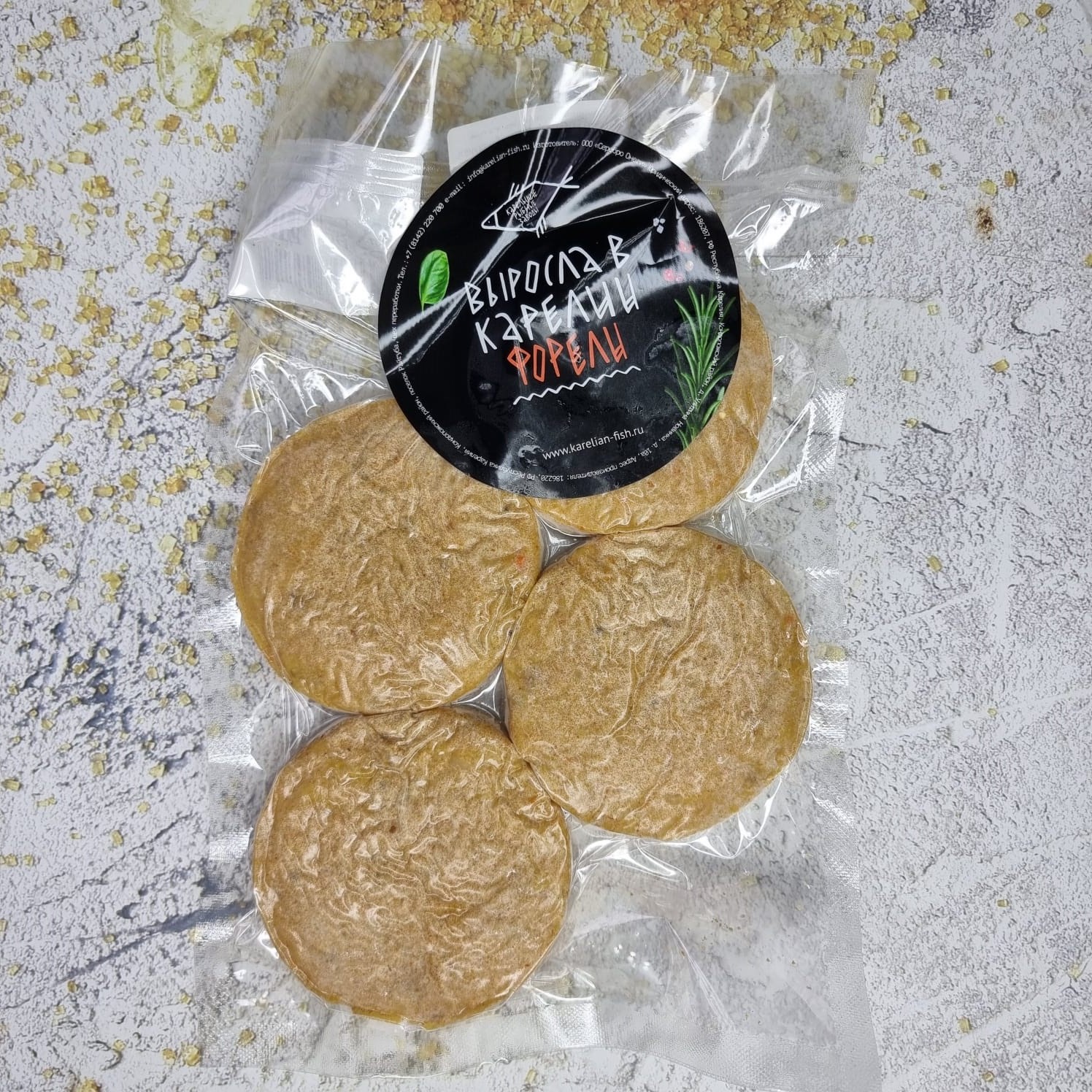 Филе форели радужной, лук репчатый, вода питьевая, меланж яичный, соль поваренная пищевая, сахароза, глюкоза,мальтодекстрин кукурузный , специи и экстракты специй (морковь, горчица, куркума, перец черный молотый, сельдерей, чили перец, мускатный орех, паприка, белый перец.)