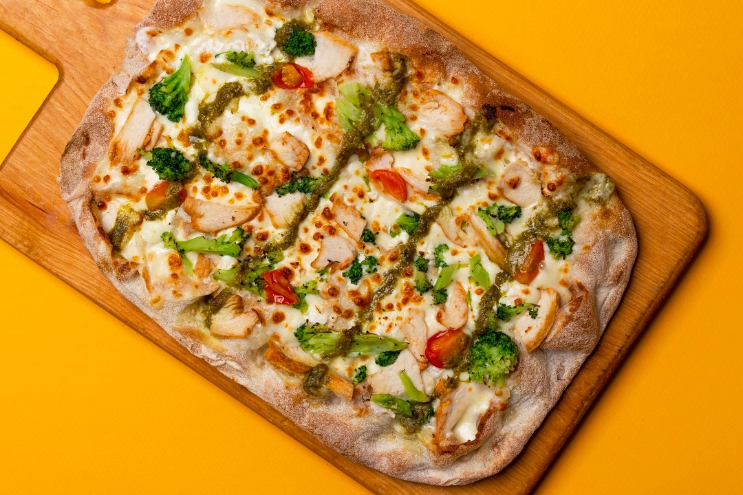 Удачное сочетание куриного мяса с соусом песто на хрустящем тесте. Выпекайте 11 минут в духовке при температуре 210*С