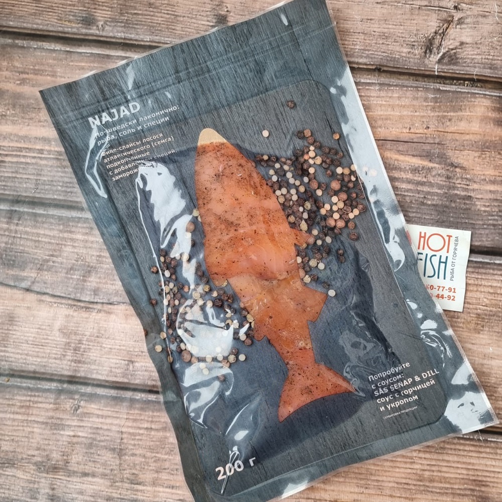 Нежные ломтики семги слегка подкопченые с тонким ароматом специй.