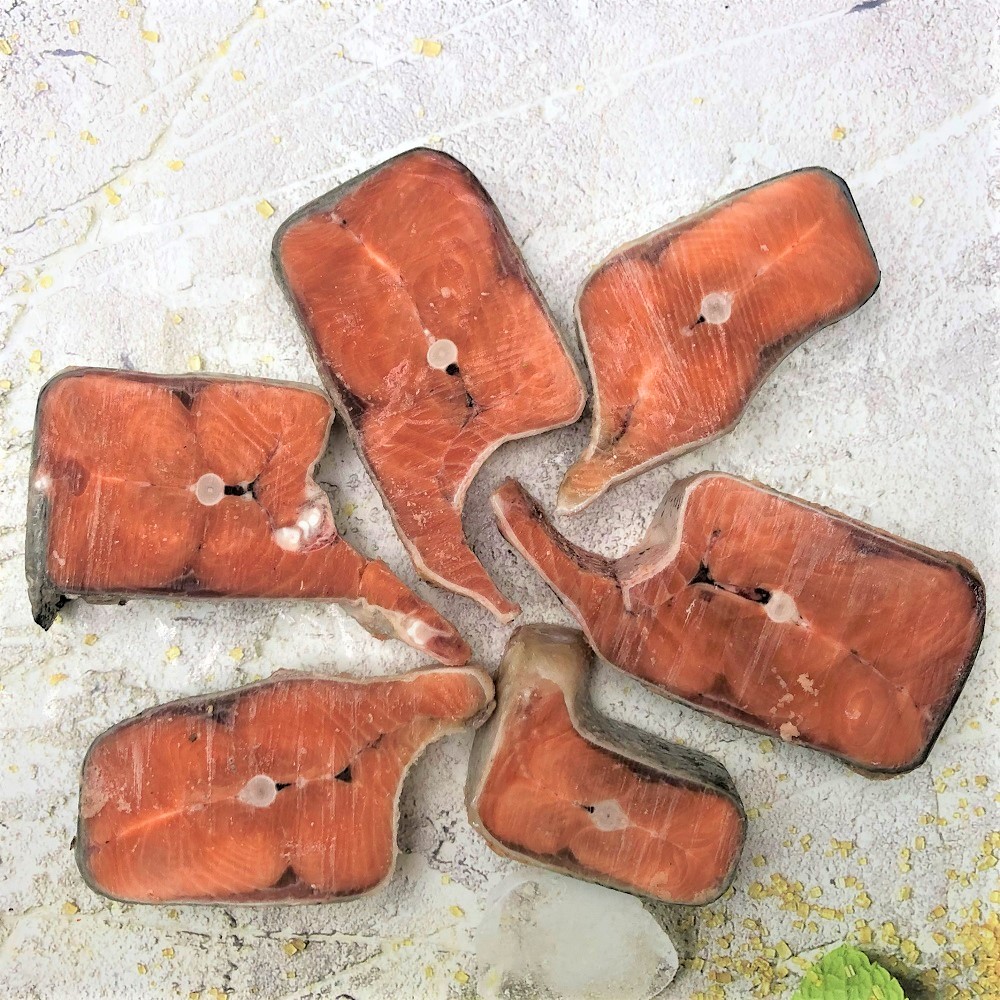 Мы напилили стейки из всеми любимой кеты "Канадка", отборной крупной особи весом в среднем 2,5 килограмма. Приголовок и хвост пошел на суповой набор (раздел Субродукты)