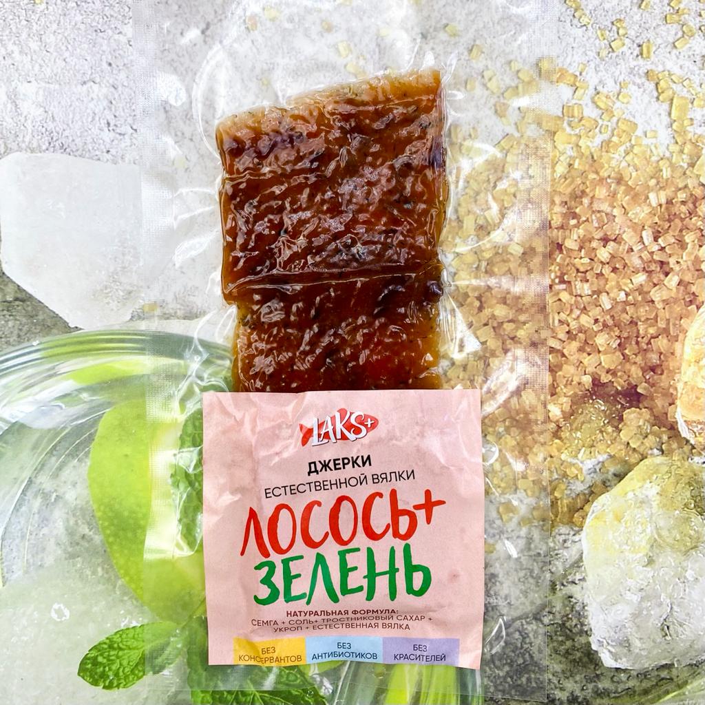 Джерки Laks + натурального копчения и естественной вялки из лосося атлантического (семги) с добавлением зелени