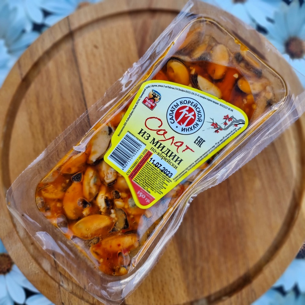 Мидии бланшированные, соль, сахар, кунжутное масло, уксус, чеснок, кориандр