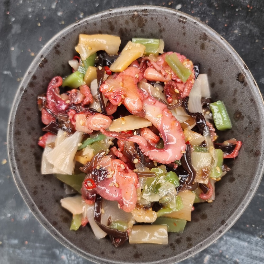 Сочетание вкусов осьминогов , хрустящей текстуры побегов бамбука, папоротника, древесного гриба, посыпанное кунжутом- украсит любой праздничный стол.